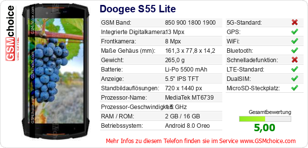 Hast du eigene Webseite? Willst du die Informationen über Standarddaten des Handys Doogee S55 Lite irgendwo veröffentlichen? Das ist sehr einfach. Du kannst das Bild herunterladen oder kopieren und auf der Webseite folgenden Code hinzufügen:Das Einfügen von diesem Code verursacht das Anzeigen von dem folgenden Bild: