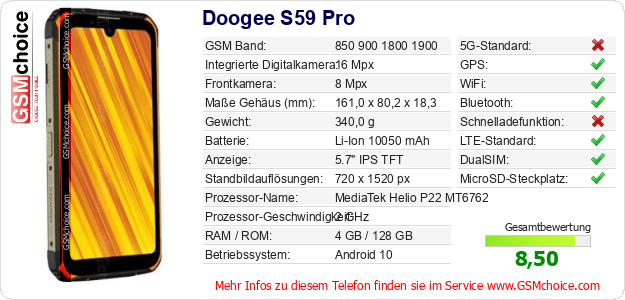 Hast du eigene Webseite? Willst du die Informationen über Standarddaten des Handys Doogee S59 Pro irgendwo veröffentlichen? Das ist sehr einfach. Du kannst das Bild herunterladen oder kopieren und auf der Webseite folgenden Code hinzufügen:Das Einfügen von diesem Code verursacht das Anzeigen von dem folgenden Bild: