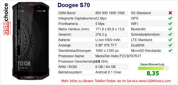 Hast du eigene Webseite? Willst du die Informationen über Standarddaten des Handys Doogee S70 irgendwo veröffentlichen? Das ist sehr einfach. Du kannst das Bild herunterladen oder kopieren und auf der Webseite folgenden Code hinzufügen:Das Einfügen von diesem Code verursacht das Anzeigen von dem folgenden Bild: