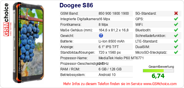 Hast du eigene Webseite? Willst du die Informationen über Standarddaten des Handys Doogee S86 irgendwo veröffentlichen? Das ist sehr einfach. Du kannst das Bild herunterladen oder kopieren und auf der Webseite folgenden Code hinzufügen:Das Einfügen von diesem Code verursacht das Anzeigen von dem folgenden Bild: