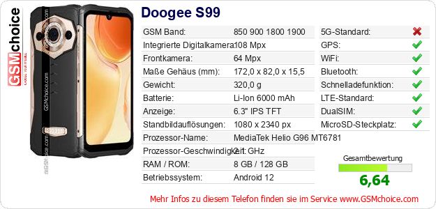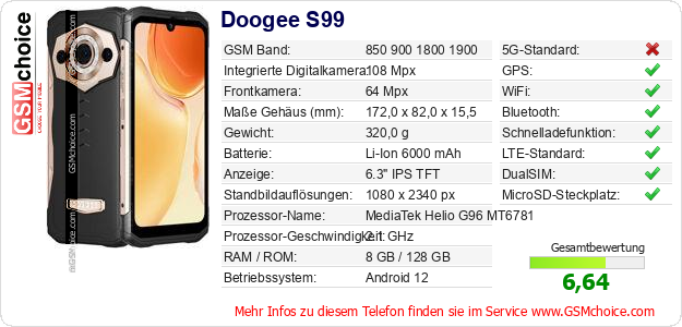 Hast du eigene Webseite? Willst du die Informationen über Standarddaten des Handys Doogee S99 irgendwo veröffentlichen? Das ist sehr einfach. Du kannst das Bild herunterladen oder kopieren und auf der Webseite folgenden Code hinzufügen:Das Einfügen von diesem Code verursacht das Anzeigen von dem folgenden Bild: