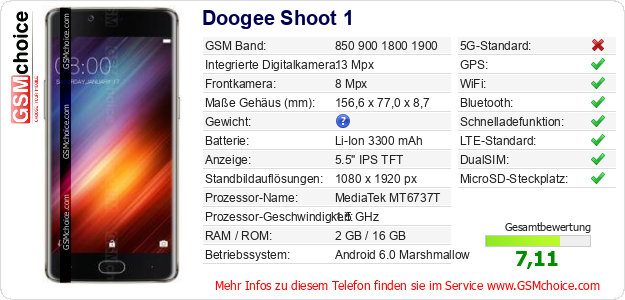 Hast du eigene Webseite? Willst du die Informationen über Standarddaten des Handys Doogee Shoot 1 irgendwo veröffentlichen? Das ist sehr einfach. Du kannst das Bild herunterladen oder kopieren und auf der Webseite folgenden Code hinzufügen:Das Einfügen von diesem Code verursacht das Anzeigen von dem folgenden Bild: