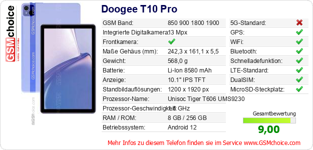 Hast du eigene Webseite? Willst du die Informationen über Standarddaten des Handys Doogee T10 Pro irgendwo veröffentlichen? Das ist sehr einfach. Du kannst das Bild herunterladen oder kopieren und auf der Webseite folgenden Code hinzufügen:Das Einfügen von diesem Code verursacht das Anzeigen von dem folgenden Bild: