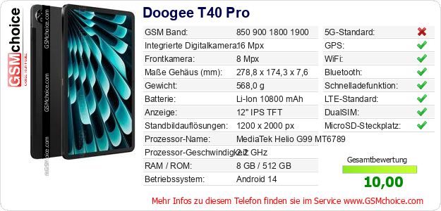 Hast du eigene Webseite? Willst du die Informationen über Standarddaten des Handys Doogee T40 Pro irgendwo veröffentlichen? Das ist sehr einfach. Du kannst das Bild herunterladen oder kopieren und auf der Webseite folgenden Code hinzufügen:Das Einfügen von diesem Code verursacht das Anzeigen von dem folgenden Bild: