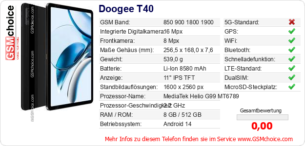 Hast du eigene Webseite? Willst du die Informationen über Standarddaten des Handys Doogee T40 irgendwo veröffentlichen? Das ist sehr einfach. Du kannst das Bild herunterladen oder kopieren und auf der Webseite folgenden Code hinzufügen:Das Einfügen von diesem Code verursacht das Anzeigen von dem folgenden Bild:
