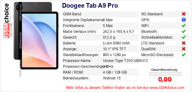 Hast du eigene Webseite? Willst du die Informationen über Standarddaten des Handys Doogee Tab A9 Pro irgendwo veröffentlichen? Das ist sehr einfach. Du kannst das Bild herunterladen oder kopieren und auf der Webseite folgenden Code hinzufügen:Das Einfügen von diesem Code verursacht das Anzeigen von dem folgenden Bild: