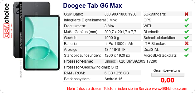 Hast du eigene Webseite? Willst du die Informationen über Standarddaten des Handys Doogee Tab G6 Max irgendwo veröffentlichen? Das ist sehr einfach. Du kannst das Bild herunterladen oder kopieren und auf der Webseite folgenden Code hinzufügen:Das Einfügen von diesem Code verursacht das Anzeigen von dem folgenden Bild: