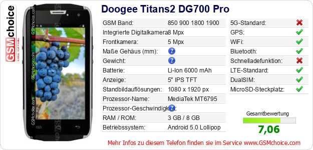 Hast du eigene Webseite? Willst du die Informationen über Standarddaten des Handys Doogee Titans2 DG700 Pro irgendwo veröffentlichen? Das ist sehr einfach. Du kannst das Bild herunterladen oder kopieren und auf der Webseite folgenden Code hinzufügen:Das Einfügen von diesem Code verursacht das Anzeigen von dem folgenden Bild: