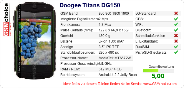 Hast du eigene Webseite? Willst du die Informationen über Standarddaten des Handys Doogee Titans DG150 irgendwo veröffentlichen? Das ist sehr einfach. Du kannst das Bild herunterladen oder kopieren und auf der Webseite folgenden Code hinzufügen:Das Einfügen von diesem Code verursacht das Anzeigen von dem folgenden Bild: