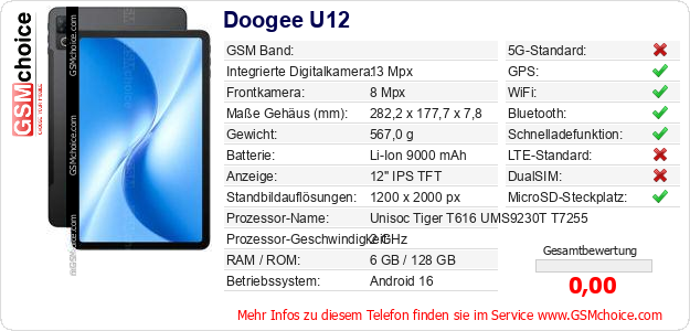Hast du eigene Webseite? Willst du die Informationen über Standarddaten des Handys Doogee U12 irgendwo veröffentlichen? Das ist sehr einfach. Du kannst das Bild herunterladen oder kopieren und auf der Webseite folgenden Code hinzufügen:Das Einfügen von diesem Code verursacht das Anzeigen von dem folgenden Bild: