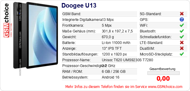 Hast du eigene Webseite? Willst du die Informationen über Standarddaten des Handys Doogee U13 irgendwo veröffentlichen? Das ist sehr einfach. Du kannst das Bild herunterladen oder kopieren und auf der Webseite folgenden Code hinzufügen:Das Einfügen von diesem Code verursacht das Anzeigen von dem folgenden Bild: