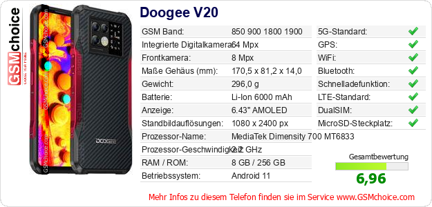 Hast du eigene Webseite? Willst du die Informationen über Standarddaten des Handys Doogee V20 irgendwo veröffentlichen? Das ist sehr einfach. Du kannst das Bild herunterladen oder kopieren und auf der Webseite folgenden Code hinzufügen:Das Einfügen von diesem Code verursacht das Anzeigen von dem folgenden Bild:
