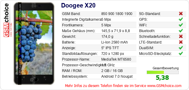 Hast du eigene Webseite? Willst du die Informationen über Standarddaten des Handys Doogee X20 irgendwo veröffentlichen? Das ist sehr einfach. Du kannst das Bild herunterladen oder kopieren und auf der Webseite folgenden Code hinzufügen:Das Einfügen von diesem Code verursacht das Anzeigen von dem folgenden Bild:
