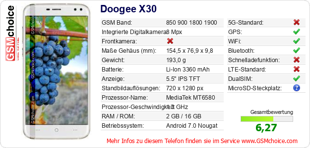 Hast du eigene Webseite? Willst du die Informationen über Standarddaten des Handys Doogee X30 irgendwo veröffentlichen? Das ist sehr einfach. Du kannst das Bild herunterladen oder kopieren und auf der Webseite folgenden Code hinzufügen:Das Einfügen von diesem Code verursacht das Anzeigen von dem folgenden Bild: