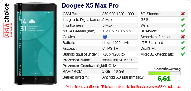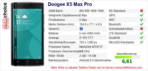 Daten des Mobiltelefons Doogee X5 Max Pro auf Ihrer Seite