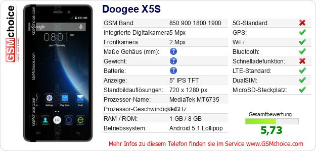 Daten des Mobiltelefons Doogee X5S auf Ihrer Seite