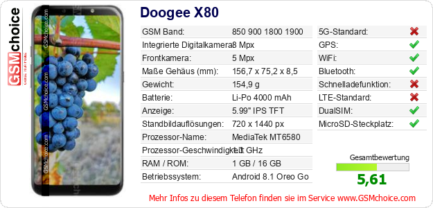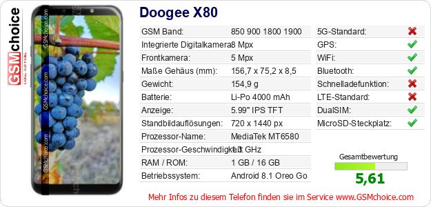 Hast du eigene Webseite? Willst du die Informationen über Standarddaten des Handys Doogee X80 irgendwo veröffentlichen? Das ist sehr einfach. Du kannst das Bild herunterladen oder kopieren und auf der Webseite folgenden Code hinzufügen:Das Einfügen von diesem Code verursacht das Anzeigen von dem folgenden Bild: