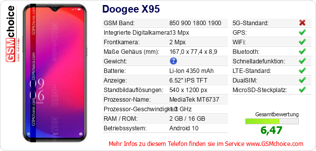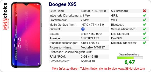 Hast du eigene Webseite? Willst du die Informationen über Standarddaten des Handys Doogee X95 irgendwo veröffentlichen? Das ist sehr einfach. Du kannst das Bild herunterladen oder kopieren und auf der Webseite folgenden Code hinzufügen:Das Einfügen von diesem Code verursacht das Anzeigen von dem folgenden Bild: