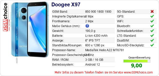 Hast du eigene Webseite? Willst du die Informationen über Standarddaten des Handys Doogee X97 irgendwo veröffentlichen? Das ist sehr einfach. Du kannst das Bild herunterladen oder kopieren und auf der Webseite folgenden Code hinzufügen:Das Einfügen von diesem Code verursacht das Anzeigen von dem folgenden Bild: