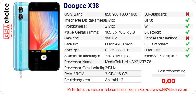 Hast du eigene Webseite? Willst du die Informationen über Standarddaten des Handys Doogee X98 irgendwo veröffentlichen? Das ist sehr einfach. Du kannst das Bild herunterladen oder kopieren und auf der Webseite folgenden Code hinzufügen:Das Einfügen von diesem Code verursacht das Anzeigen von dem folgenden Bild: