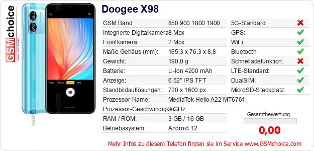 Daten des Mobiltelefons Doogee X98 auf Ihrer Seite