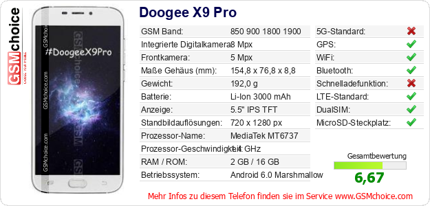 Hast du eigene Webseite? Willst du die Informationen über Standarddaten des Handys Doogee X9 Pro irgendwo veröffentlichen? Das ist sehr einfach. Du kannst das Bild herunterladen oder kopieren und auf der Webseite folgenden Code hinzufügen:Das Einfügen von diesem Code verursacht das Anzeigen von dem folgenden Bild: