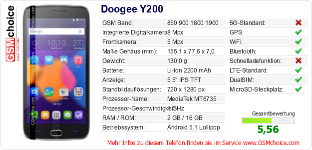 Hast du eigene Webseite? Willst du die Informationen über Standarddaten des Handys Doogee Y200 irgendwo veröffentlichen? Das ist sehr einfach. Du kannst das Bild herunterladen oder kopieren und auf der Webseite folgenden Code hinzufügen:Das Einfügen von diesem Code verursacht das Anzeigen von dem folgenden Bild: