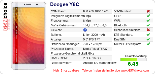 Hast du eigene Webseite? Willst du die Informationen über Standarddaten des Handys Doogee Y6C irgendwo veröffentlichen? Das ist sehr einfach. Du kannst das Bild herunterladen oder kopieren und auf der Webseite folgenden Code hinzufügen:Das Einfügen von diesem Code verursacht das Anzeigen von dem folgenden Bild: