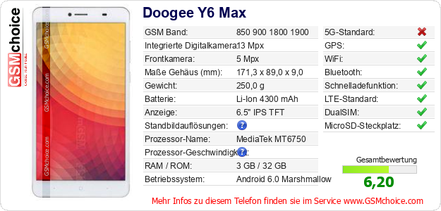 Hast du eigene Webseite? Willst du die Informationen über Standarddaten des Handys Doogee Y6 Max irgendwo veröffentlichen? Das ist sehr einfach. Du kannst das Bild herunterladen oder kopieren und auf der Webseite folgenden Code hinzufügen:Das Einfügen von diesem Code verursacht das Anzeigen von dem folgenden Bild:
