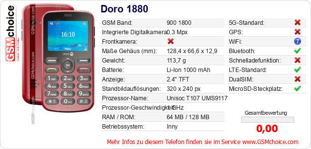 Hast du eigene Webseite? Willst du die Informationen über Standarddaten des Handys Doro 1880 irgendwo veröffentlichen? Das ist sehr einfach. Du kannst das Bild herunterladen oder kopieren und auf der Webseite folgenden Code hinzufügen:Das Einfügen von diesem Code verursacht das Anzeigen von dem folgenden Bild: