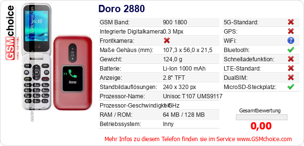 Hast du eigene Webseite? Willst du die Informationen über Standarddaten des Handys Doro 2880 irgendwo veröffentlichen? Das ist sehr einfach. Du kannst das Bild herunterladen oder kopieren und auf der Webseite folgenden Code hinzufügen:Das Einfügen von diesem Code verursacht das Anzeigen von dem folgenden Bild: