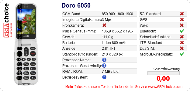 Hast du eigene Webseite? Willst du die Informationen über Standarddaten des Handys Doro 6050 irgendwo veröffentlichen? Das ist sehr einfach. Du kannst das Bild herunterladen oder kopieren und auf der Webseite folgenden Code hinzufügen:Das Einfügen von diesem Code verursacht das Anzeigen von dem folgenden Bild: