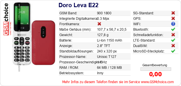 Hast du eigene Webseite? Willst du die Informationen über Standarddaten des Handys Doro Leva E22 irgendwo veröffentlichen? Das ist sehr einfach. Du kannst das Bild herunterladen oder kopieren und auf der Webseite folgenden Code hinzufügen:Das Einfügen von diesem Code verursacht das Anzeigen von dem folgenden Bild:
