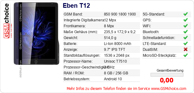 Hast du eigene Webseite? Willst du die Informationen über Standarddaten des Handys Eben T12 irgendwo veröffentlichen? Das ist sehr einfach. Du kannst das Bild herunterladen oder kopieren und auf der Webseite folgenden Code hinzufügen:Das Einfügen von diesem Code verursacht das Anzeigen von dem folgenden Bild: