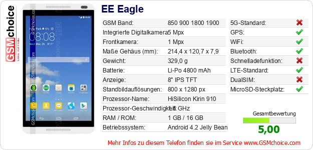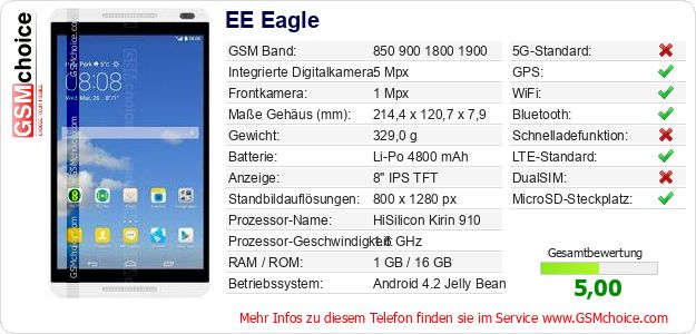 Hast du eigene Webseite? Willst du die Informationen über Standarddaten des Handys EE Eagle irgendwo veröffentlichen? Das ist sehr einfach. Du kannst das Bild herunterladen oder kopieren und auf der Webseite folgenden Code hinzufügen:Das Einfügen von diesem Code verursacht das Anzeigen von dem folgenden Bild: