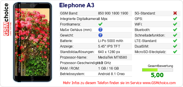 Hast du eigene Webseite? Willst du die Informationen über Standarddaten des Handys Elephone A3 irgendwo veröffentlichen? Das ist sehr einfach. Du kannst das Bild herunterladen oder kopieren und auf der Webseite folgenden Code hinzufügen:Das Einfügen von diesem Code verursacht das Anzeigen von dem folgenden Bild: