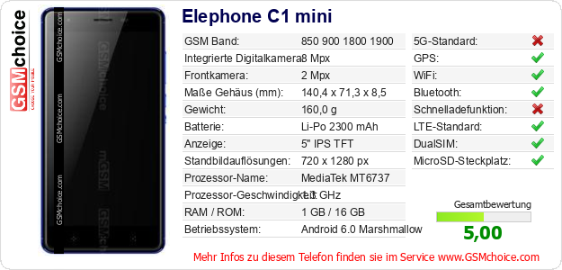 Hast du eigene Webseite? Willst du die Informationen über Standarddaten des Handys Elephone C1 mini irgendwo veröffentlichen? Das ist sehr einfach. Du kannst das Bild herunterladen oder kopieren und auf der Webseite folgenden Code hinzufügen:Das Einfügen von diesem Code verursacht das Anzeigen von dem folgenden Bild: