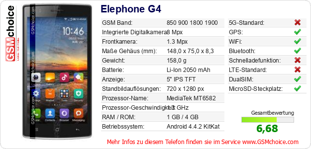Hast du eigene Webseite? Willst du die Informationen über Standarddaten des Handys Elephone G4 irgendwo veröffentlichen? Das ist sehr einfach. Du kannst das Bild herunterladen oder kopieren und auf der Webseite folgenden Code hinzufügen:Das Einfügen von diesem Code verursacht das Anzeigen von dem folgenden Bild: