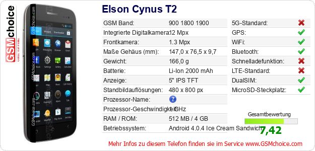 Hast du eigene Webseite? Willst du die Informationen über Standarddaten des Handys Elson Cynus T2 irgendwo veröffentlichen? Das ist sehr einfach. Du kannst das Bild herunterladen oder kopieren und auf der Webseite folgenden Code hinzufügen:Das Einfügen von diesem Code verursacht das Anzeigen von dem folgenden Bild:
