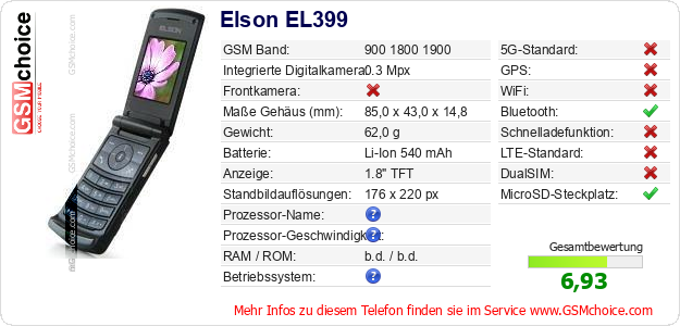 Hast du eigene Webseite? Willst du die Informationen über Standarddaten des Handys Elson EL399 irgendwo veröffentlichen? Das ist sehr einfach. Du kannst das Bild herunterladen oder kopieren und auf der Webseite folgenden Code hinzufügen:Das Einfügen von diesem Code verursacht das Anzeigen von dem folgenden Bild: