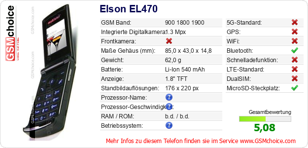 Hast du eigene Webseite? Willst du die Informationen über Standarddaten des Handys Elson EL470 irgendwo veröffentlichen? Das ist sehr einfach. Du kannst das Bild herunterladen oder kopieren und auf der Webseite folgenden Code hinzufügen:Das Einfügen von diesem Code verursacht das Anzeigen von dem folgenden Bild: