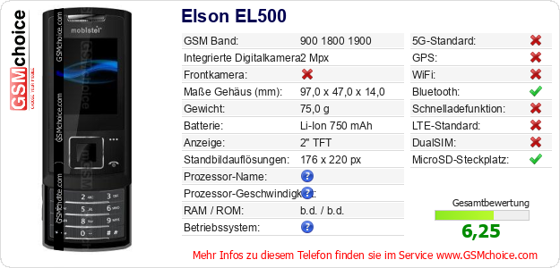 Hast du eigene Webseite? Willst du die Informationen über Standarddaten des Handys Elson EL500 irgendwo veröffentlichen? Das ist sehr einfach. Du kannst das Bild herunterladen oder kopieren und auf der Webseite folgenden Code hinzufügen:Das Einfügen von diesem Code verursacht das Anzeigen von dem folgenden Bild: