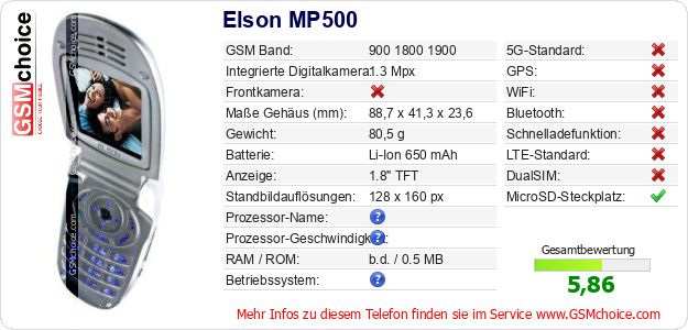 Hast du eigene Webseite? Willst du die Informationen über Standarddaten des Handys Elson MP500 irgendwo veröffentlichen? Das ist sehr einfach. Du kannst das Bild herunterladen oder kopieren und auf der Webseite folgenden Code hinzufügen:Das Einfügen von diesem Code verursacht das Anzeigen von dem folgenden Bild: