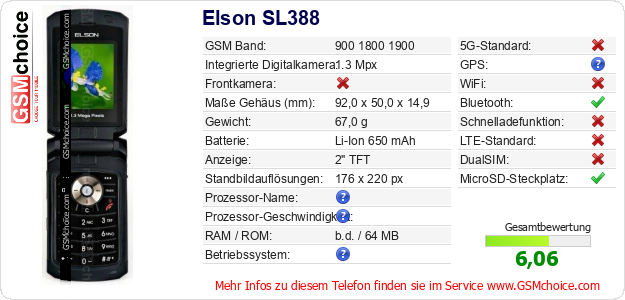 Hast du eigene Webseite? Willst du die Informationen über Standarddaten des Handys Elson SL388 irgendwo veröffentlichen? Das ist sehr einfach. Du kannst das Bild herunterladen oder kopieren und auf der Webseite folgenden Code hinzufügen:Das Einfügen von diesem Code verursacht das Anzeigen von dem folgenden Bild: