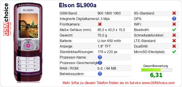 Hast du eigene Webseite? Willst du die Informationen über Standarddaten des Handys Elson SL900a irgendwo veröffentlichen? Das ist sehr einfach. Du kannst das Bild herunterladen oder kopieren und auf der Webseite folgenden Code hinzufügen:Das Einfügen von diesem Code verursacht das Anzeigen von dem folgenden Bild:
