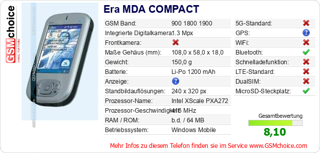 Hast du eigene Webseite? Willst du die Informationen über Standarddaten des Handys Era MDA COMPACT irgendwo veröffentlichen? Das ist sehr einfach. Du kannst das Bild herunterladen oder kopieren und auf der Webseite folgenden Code hinzufügen:Das Einfügen von diesem Code verursacht das Anzeigen von dem folgenden Bild: