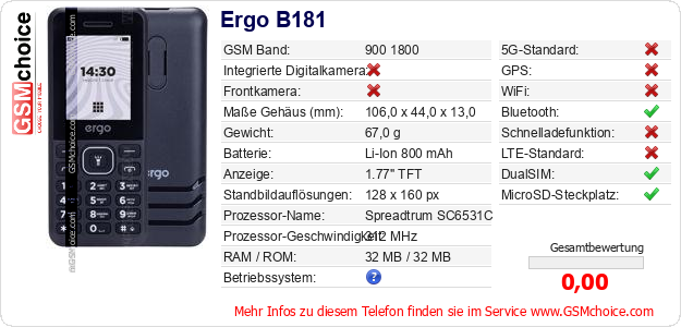 Hast du eigene Webseite? Willst du die Informationen über Standarddaten des Handys Ergo B181 irgendwo veröffentlichen? Das ist sehr einfach. Du kannst das Bild herunterladen oder kopieren und auf der Webseite folgenden Code hinzufügen:Das Einfügen von diesem Code verursacht das Anzeigen von dem folgenden Bild: