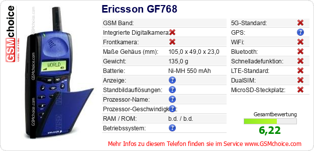 Hast du eigene Webseite? Willst du die Informationen über Standarddaten des Handys Ericsson GF768 irgendwo veröffentlichen? Das ist sehr einfach. Du kannst das Bild herunterladen oder kopieren und auf der Webseite folgenden Code hinzufügen:Das Einfügen von diesem Code verursacht das Anzeigen von dem folgenden Bild: