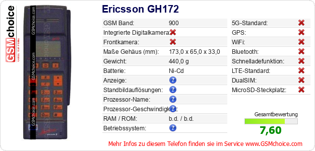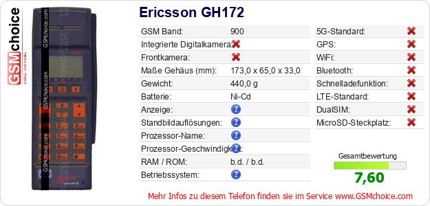 Hast du eigene Webseite? Willst du die Informationen über Standarddaten des Handys Ericsson GH172 irgendwo veröffentlichen? Das ist sehr einfach. Du kannst das Bild herunterladen oder kopieren und auf der Webseite folgenden Code hinzufügen:Das Einfügen von diesem Code verursacht das Anzeigen von dem folgenden Bild: