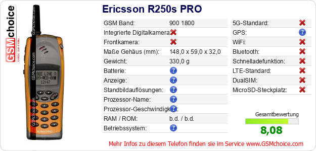 Hast du eigene Webseite? Willst du die Informationen über Standarddaten des Handys Ericsson R250s PRO irgendwo veröffentlichen? Das ist sehr einfach. Du kannst das Bild herunterladen oder kopieren und auf der Webseite folgenden Code hinzufügen:Das Einfügen von diesem Code verursacht das Anzeigen von dem folgenden Bild: